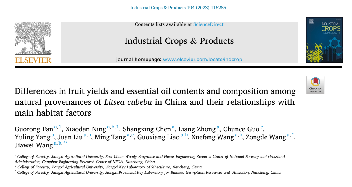 山苍子资源培育与利用是77779193永利官网木本香料团队的重点研究方向,该研究由团队成员范国荣研究员为论文第一作者,研究生宁晓丹为论文共同第一作者,汪加魏博士和王宗德教授为论文共同通讯作者。研究得到了国家重点研发计划课题、江西省重大科技研发专项、江西省林业局樟树研究专项和江西省千人计划、江西省主要学科学术和技术带头人--领军人才项目的支持。